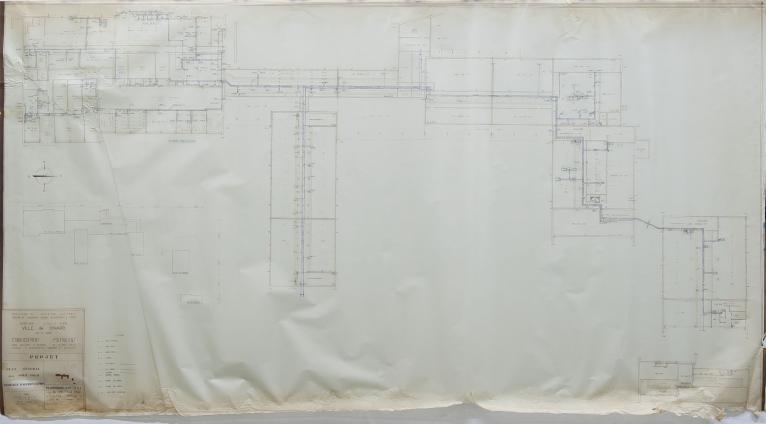 Services généraux : plan du rez-de-chaussée : noter la taille des garages à vélos et la présence d'un foyer et d'études. A l'étage étaient implantés les réfectoires et la cuisine. Patrice Simon, architecte, 1962.
