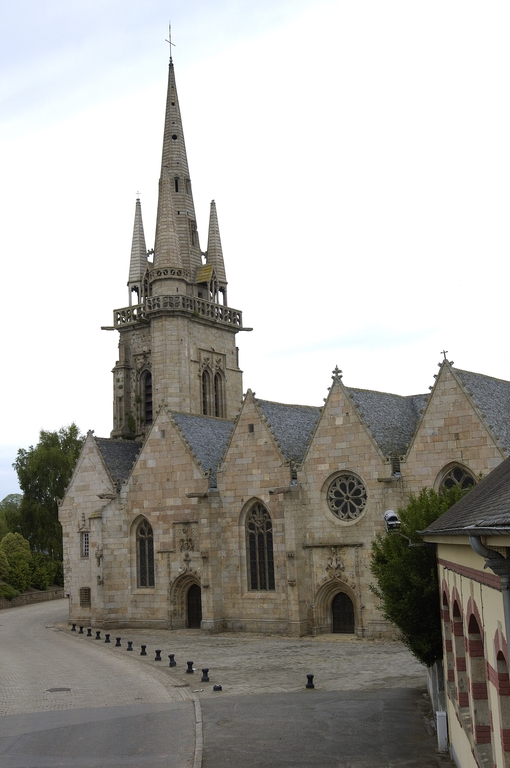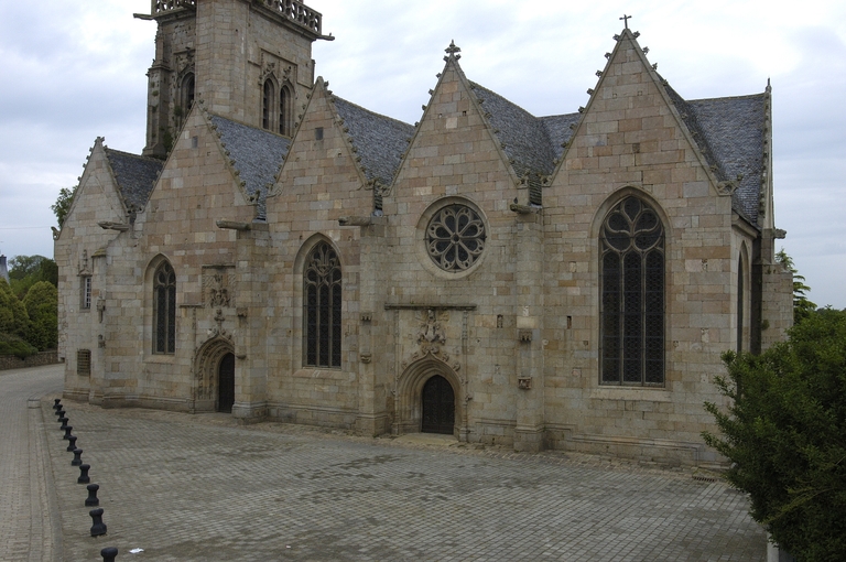 Ordonnance extérieure L´édifice est précédé à l´ouest par une imposante tour carrée, formant porche. Le portail ouest, dont les ressauts de la voussure en arc brisé sont ornés de frises végétales et couronnés par une archivolte à choux et fleuron, s´inscrit entre deux contreforts en équerre qui épaulent la tour. Un arc segmentaire au réseau d´intrados polylobé lancé entre les contreforts et surmonté d´un gâble forme auvent au-dessus du portail. Chaque face de la tour est percée de deux baies géminées en arc brisé surmontées d´accolades à choux frisés et fleuron. De la plate-forme entourée d´un garde-corps ajouré de deux rangs de mouchettes s´élève une flèche de granite octogonale, cantonnée de trois clochetons hexagonaux et, à l´angle sud-est, d´un quatrième de proportions plus importantes et à huit pans, qui couronne la vis d´escalier. Sur les faces cardinales de la flèche s´adossent d´élégants gâbles construits ajourés retombant sur des colonnettes. Ce parti modernise un modèle donné deux siècles plus tôt par la tour de croisée de Guingamp et repris dans de nombreux clochers du Trégor. La façade méridionale, richement traitée, présente une succession de cinq pignons dont les rampants sont garnis de choux frisés. Les contreforts s´ornent de niches à dais dans la tradition cornouaillaise, comme ceux de la tour, et sont surmontés de gargouilles à sujets satiriques. La travée occidentale, correspondant à la sacristie, plus récente que les autres, s´en distingue par une introduction du répertoire décoratif de la Renaissance : pilastres ornés de losanges et candélabres se mêlent aux arcs en accolade du gothique tardif. Au rez-de-chaussée, ses fenêtres ouest et sud, rectangulaires, sont protégées par des grilles en fer forgé ornées de lys et d´hermines. Les pignons correspondant aux première et troisième travées du bas-côté sont percés de portails en arc brisé encadrés par des pinacles. Le premier à l´ouest, décentré vers la droite, reprend le parti du portail occidental, mais avec seulement deux ressauts ornés de frises de feuillage. Il est surmonté d´un monumental motif héraldique composé de deux lions portant un écu semé d´hermines et sommé du casque des Montfort, se détachant sur un fond de cordelières. Le second, désaxé vers la gauche, a une voussure à ressauts simplement moulurés, également surmontée des armoiries ducales. La porte a conservé ses vantaux sculptés du début du 16e siècle illustrant l´Annonciation. Au-dessus est percée une rose à huit lobes. Au chevet, sous la maîtresse-vitre, une fontaine est surmontée d´une arcade moulurée en plein-cintre au fond de laquelle est ménagée une niche à dais flamboyant qui abritait une statue en bois de la Vierge à l´Enfant. La façade nord, plus sobre, est percée de trois baies et d´une petite porte en arc brisé avec archivolte en accolade et fleuron.
