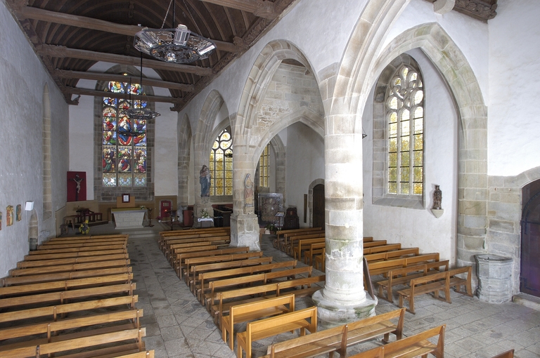 Plan et ordonnance intérieure Le village de Beuzit possédait une carrière de granite d´où provient la pierre employée pour la construction, réalisée pour le gros-oeuvre entre mars 1507 et février 1509. L´édifice présente de ce fait une remarquable homogénéité. Le parti, un vaisseau de quatre travées, flanqué au sud d´un unique bas-côté, évoque l´architecture des ordres mendiants, et rappelle le rôle du frère Bilsic dans sa construction. Toutefois, un texte atteste que le projet était de donner à la chapelle située au sud du choeur, dédiée à saint Yves, sa symétrique au nord. Trois colonnes cylindriques appareillées reçoivent en pénétration les retombées des grandes arcades. Les deuxième et troisième reposent sur un socle de maçonnerie parallélépipédique, auquel des autels devaient être adossés. Des lavabos à crédence, encadrés de pilastres prismatiques et surmontés d´une accolade à crochets et fleuron, sont ménagés dans leur face sud. Le vaisseau central est couvert d´un lambris en berceau brisé, à entraits engoulés, reposant sur des sablières au riche programme sculpté. Grâces constituerait d´ailleurs le plus ancien exemple connu en Bretagne de décor en frise sur une sablière. Le bas-côté est scandé par des arcs-diaphragmes retombant en pénétration au nord sur les colonnes de la nef et au sud sur des colonnes engagées, et couvert par une succession de berceaux transversaux. Ce mode de couvrement, la présence des deux lavabos à crédence déjà signalés et de deux autres dans les murs sud et est du collatéral, invitent à restituer une série de chapelles dotées chacune d´un autel. Du reste, la présence de contreforts angulaires encadrant la maîtresse vitre, et le fait que les percements du mur gouttereau nord ne correspondent pas au rythme des travées, suggèrent que le projet initial se limitait à un vaisseau unique, et que l´on décida en cours de chantier de compléter le programme par des chapelles latérales. Au fond du bas-côté, une porte encadrée de pilastres Renaissance à motifs de losanges et de couronnes donne accès à la sacristie. La baie qui se trouve au-dessus a été murée lors de la construction de cette dernière. À droite, dans le pan coupé, une ouverture en arc brisé conduit à l´escalier en vis de la tour ; elle est fermée par une porte en menuiserie du 16e siècle.