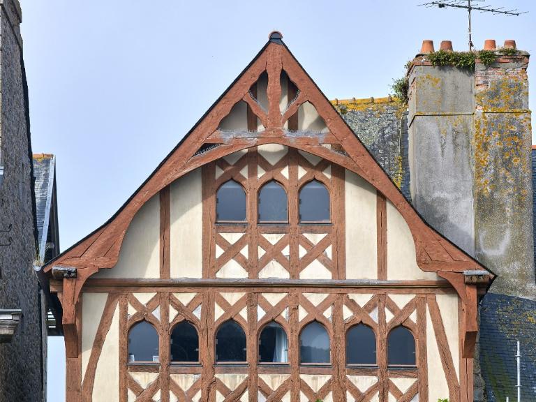 De nombreux bois ont été remplacés lors d'une restauration et la ferme débordante recréée. Une claire-voie de six baies aux linteaux en accolade est restituée au premier étage, contre sept au deuxième et troisième étage puis trois dans les combles. D'autres séries de petites fenêtres éclairent les étages du côté de la venelle. Des écharpes coudées assurent le contreventement à chaque extrémité des niveaux. Le gouttereau sud est en partie maçonné et comporte la tour d'escalier en son centre. Depuis la venelle, une porte en arc brisé ouvre sur la cour arrière.