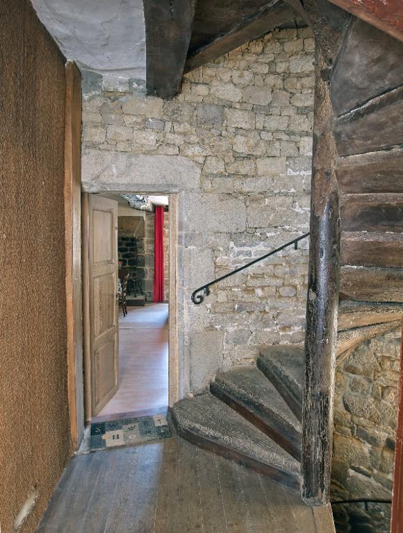 On accède à l'escalier en vis, dans œuvre, depuis une porte à imposte et linteau à coussinets dans le gouttereau. Comme à l'accoutumée, les premières marches sont en pierre puis en bois comme le noyau. Il dessert à la fois les pièces sur rue et les pièces arrières. L'intérieur du rez-de-chaussée révèle un encorbellement sur solives. On passe de la pièce avant à la pièce arrière par une porte dont les coussinets se devinent malgré le revêtement actuel. Cette pièce sur cour est chauffée par une cheminée dans le gouttereau ouest, à larges chanfreins, corbeau arrondi avec cavet et hotte pyramidale.