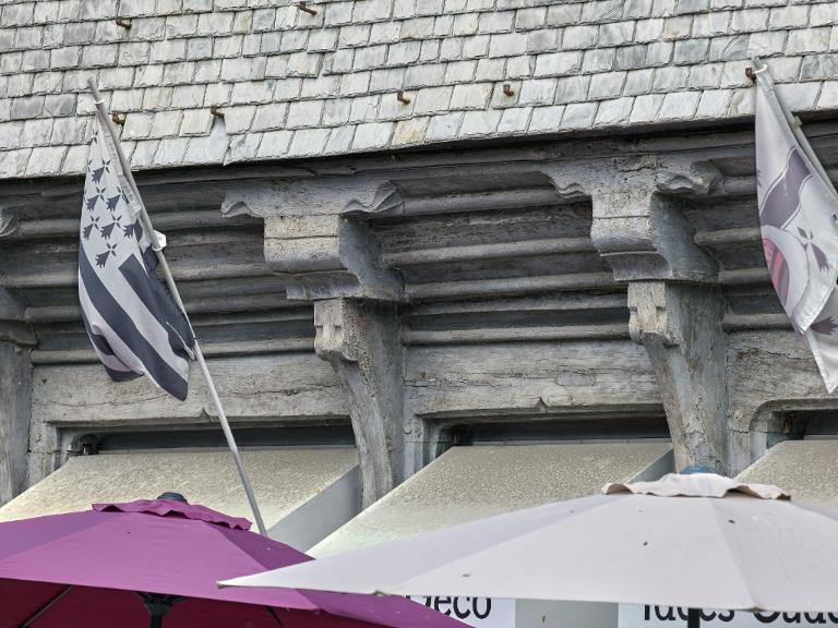 Les poteaux du rez-de-chaussée créent quatre ouvertures dont trois sur un mur-bahut remaçonné. Chaque baie est surmontée d'une accolade sculptée dans le linteau. Entretoises et sablières sont moulurées et les consoles sont sculptées d'un motif similaire au n°31 de la place. Au premier étage, un aisselier gravé des initiales R et I renforce l'angle et soutient le coyer. La ferme débordante du pignon présente un décor trilobé.