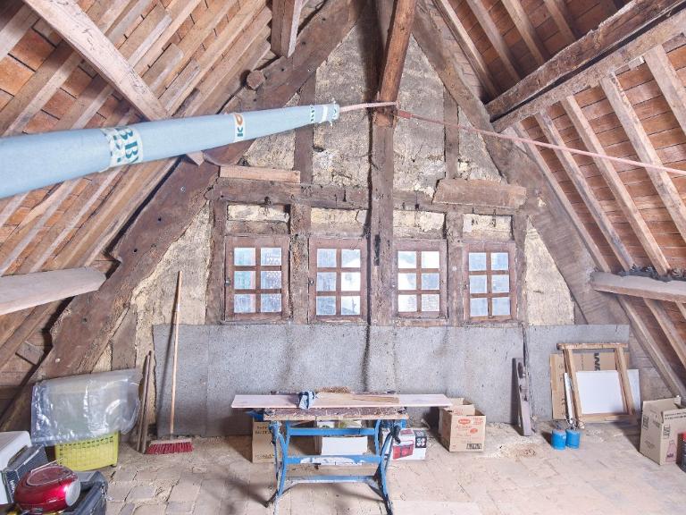 Au premier et deuxième étage, les portes sont en pierre avec linteau chanfreiné tandis qu'une porte du deuxième étage dispose d'un encadrement en bois avec accolade sur le linteau. Au premier étage, la poutre d'enrayure est soutenue en intérieur par un poteau sculpté du même motif de chanfreins et congés arrondis qu'à l'extérieur. Les autres poteaux principaux ont leurs arrêtes abattues et sont élargis en tête, sans décor. La pièce sur cour dispose d'une fenêtre avec pierre d'évier dans le pignon nord et d'une cheminée à larges chanfreins et doubles corbeaux arrondis avec cavets. Celle de la pièce sur la place s'insère dans le gouttereau ouest : mêmes doubles corbeaux avec cavets mais piédroits à doubles chanfreins.