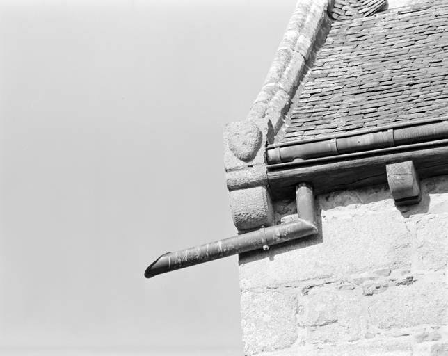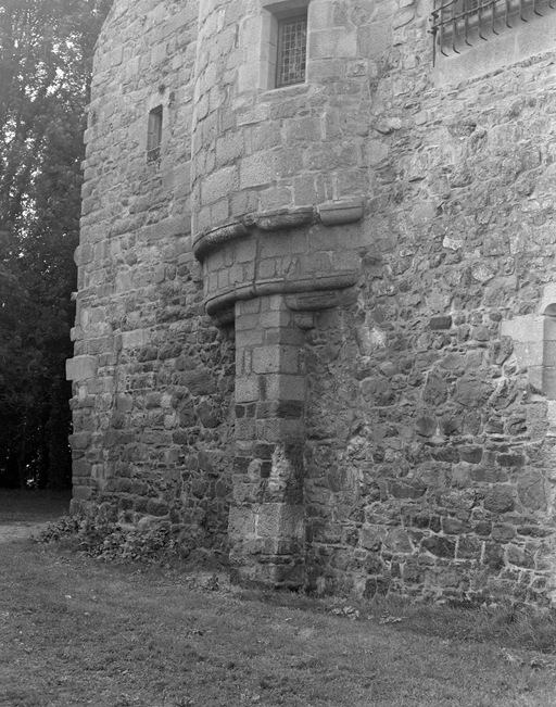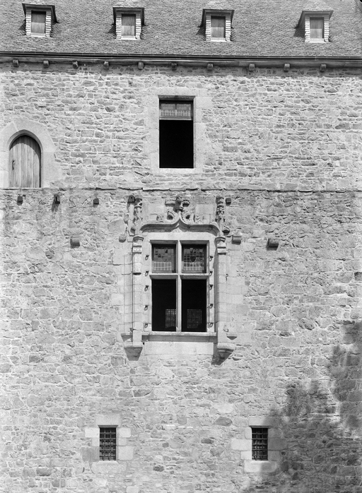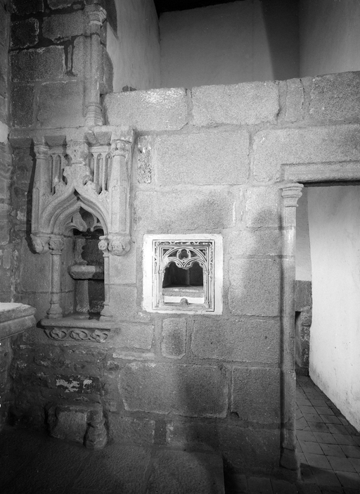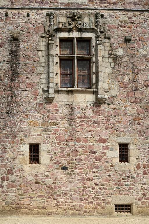 Les deux hagioscopes à claire-voie en calcaire des deux oratoires de la chapelle sont de style rayonnant : ils sont ornés en sus de pampres de vigne portant grappes et feuilles où courent des escargots (uniquement pour celui du sud). La fenêtre sur cour de la chambre seigneuriale, la crédence lavabo de la chapelle en pierre de taille de granite - ajoutée ultérieurement comme le montre l’interruption des colonnettes d’angle de l’arcade - arborent en revanche un décor gothique flamboyant.