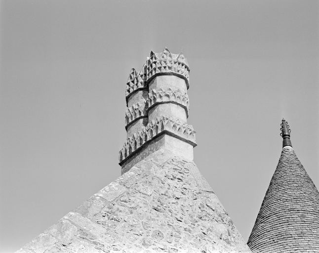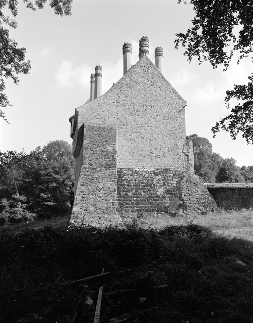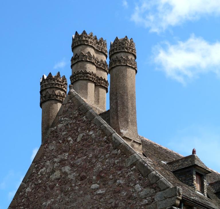 De plan octogonal, les dix-neuf souches de cheminées - simples, jumelles ou triples - sont enduites et ornées de fines plaques d’ardoises formant des motifs géométriques (voir le Carpont à Trédarzec ou Lézardré à Lézardrieux).