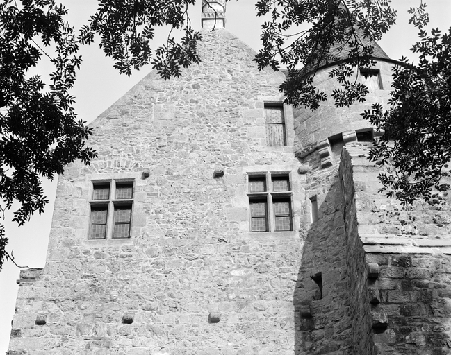 Les tours nord-est et sud-est ainsi que le chemin de ronde (situé au deuxième étage) sont flanqués de mâchicoulis supportés par trois niveaux de consoles. La coursière en encorbellement - disparue - pouvait également fonctionner comme un chemin de ronde défendant la façade principale et le pignon sud. Fenêtres à vantaux et créneaux de pied pouvaient permettre des tirs lointains ou fichant.