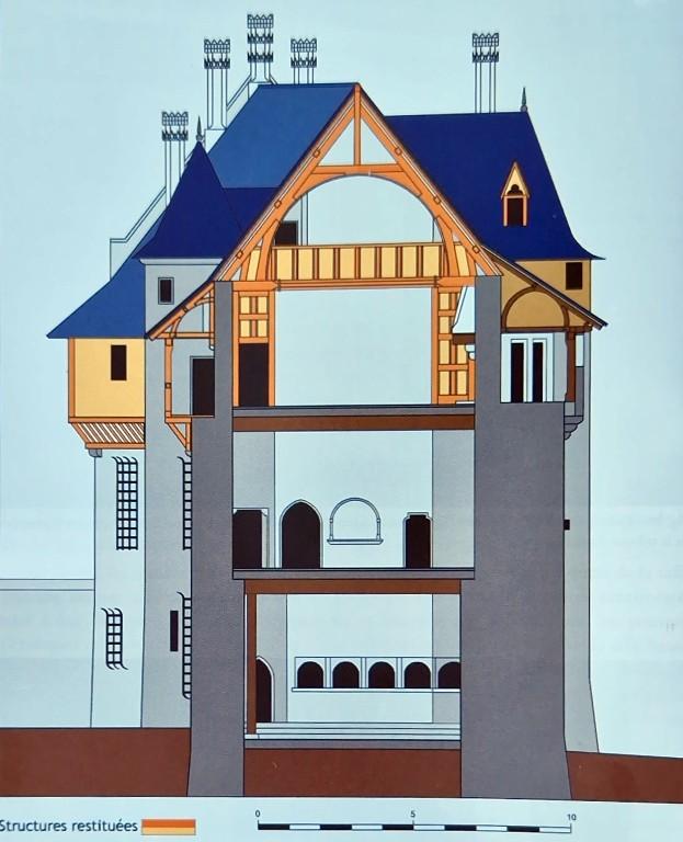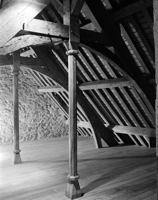 A l’exception de la chambre sud qui est doté d’un plafond, les trois pièces en enfilade - chambre nord-ouest, salle haute nord et salle haute sud - sont sous charpente. La charpente de la chambre nord-ouest conserve ses aisseliers d’origine (date d’abattage entre 1406 et 1410 par dendrochronologie).