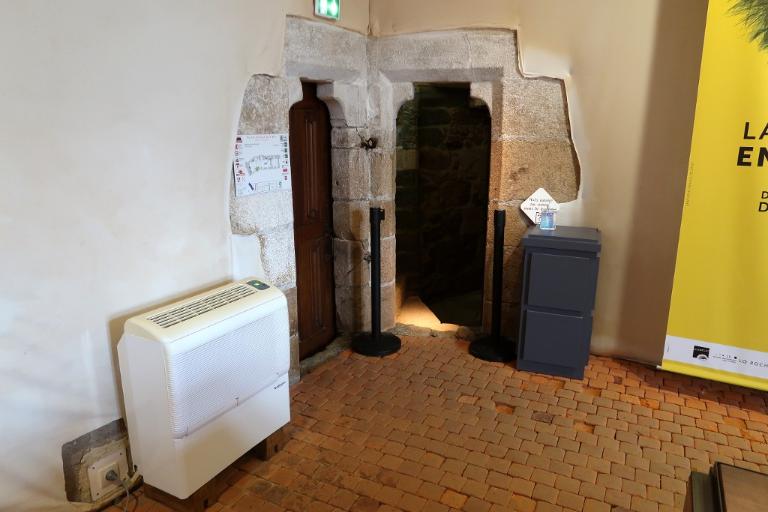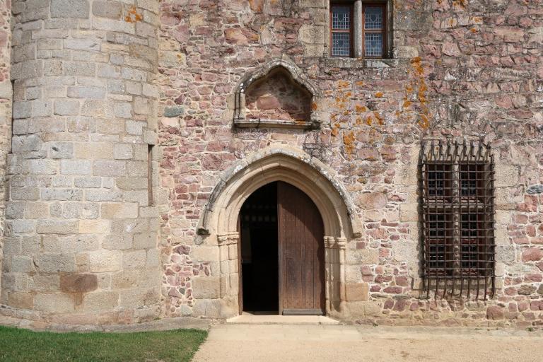 L’entrée monumentale est en arc brisé à voussure : elle est surmontée d’une niche trilobée destinée à abriter un décor héraldique. Les portes intérieures sont tantôt en arc brisé, tantôt à linteau droit sur coussinets ou à linteau droit. Les arcs des passe-plats sont en anse de panier.