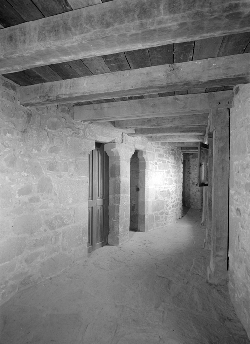 A ce niveau, l’escalier en vis dessert quatre espaces distincts : la salle haute nord, la chambre nord-ouest, le couloir menant au logement du chapelain (étage supérieur intermédiaire) et la coursière en encorbellement servant à la distribution horizontale. Pour éviter les courants d’air depuis le chemin de ronde et la coursière, les portes sont dotées de tambour.