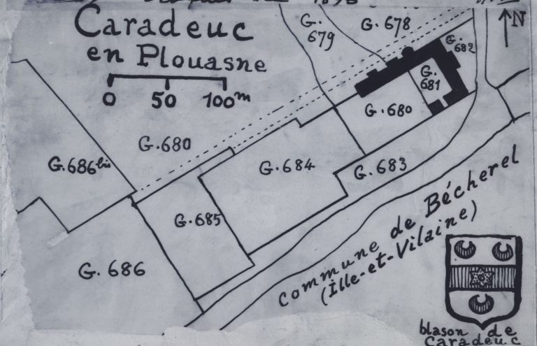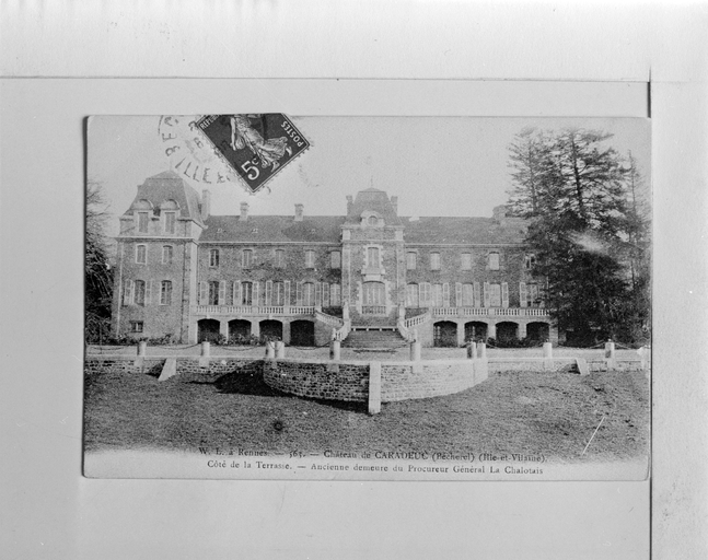 Le château de Caradeuc est construit en 1723 à l’initiative de Nicolas-Anne de Caradeuc, seigneur de La Chalotais, conseiller et doyen du Parlement de Bretagne, sur une terre qu’il détient probablement par héritage ou qu’il acquiert peu avant la construction. Aucun bâtiment antérieur n’est mentionné, ce qui suggère une édification sur un terrain vierge, propice à la réalisation d’un véritable projet architectural. Issu d’une ancienne famille d’Evran, ce magistrat rennais incarne la volonté de certains parlementaires bretons d’affirmer leur ascension sociale par des constructions monumentales en milieu rural plutôt qu’en ville. Ce choix, éloigné de l’hôtel modeste qu’il occupe à Rennes, exprime une volonté de prestige affirmée par l’architecture sur un territoire. Nicolas-Anne meurt au château en 1752.