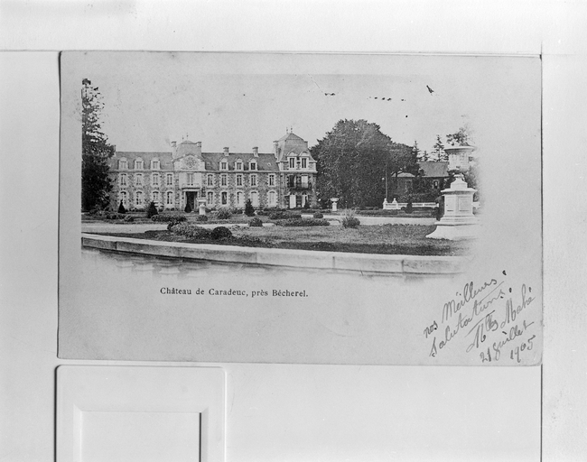 Le château de Caradeuc en Plouasné fut la propriété du procureur général de la Chalotais qui possédait également le château du Plessis à Vern-sur-Seiche de la même époque. Il fut construit pour Anne-Nicolas de Caradeuc, conseiller et doyen du Parlement de Bretagne, en 1723. Le parc du château est en Bécherel tandis que le château est en Plouasné. Le château fut modifié au début du 19e siècle (élévation sud reconstruite) puis de 1890 à 1900 (époque des frontons du pavillon central, et de la transformation du parc par Edouard André). Le parc fut redessiné à l'anglaise vers 1850 et aménagé à partir de 1898 avec de nombreux remplois provenant de régions diverses. Site classé en 1945.