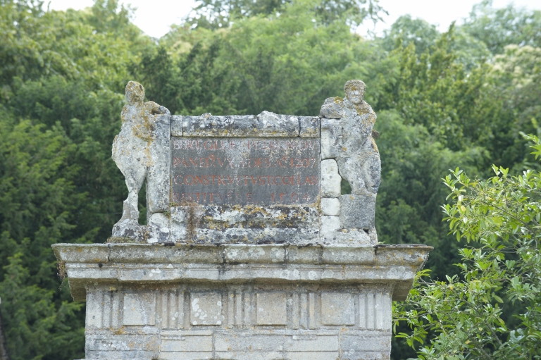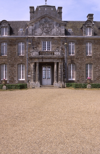 Sur le tympan central, façade sud : blason de la famille de Caradeuc accolé à celui des Martel. Devise des Caradeuc : Arreste ton coeur. (mariage avec Emilie Martel en 1821). Façade nord : armes de Caradeuc et Raille de la Fresnais.