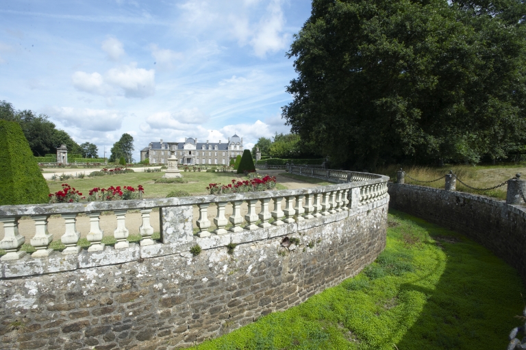 Château construit à la fin du 1er quart 18e siècle pour A. N. de Caradeuc ; élévation sud reconstruite au 19e siècle ; aménagement du parc à partir de 1898 avec de nombreux remplois provenant de régions diverses. Site classé en 1945.