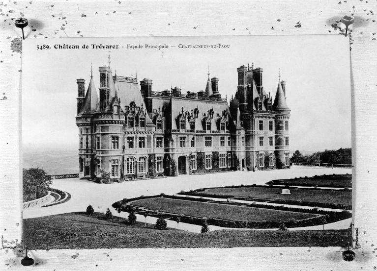 'Situé sur la commune de Saint-Goazec, au centre Finistère, dans un site surplombant la vallée de l'Aulne, le domaine de Trévarez fut construit de 1893 à 1907 non loin d'un ancien manoir. La personnalité de son commanditaire, ancien diplomate, président du Conseil général, député, associée au savoir faire d'un atelier d'architectes parisien, mondain et international, dirigé par W.A. Destailleurs, contribua à l'établissement de constructions conçues et mises en œuvre avec un soin extrême. Le château est édifié en granit de Kersanton et en brique, selon un style en accord avec les modes de vie et de représentation de la très haute bourgeoisie financière de l'époque. Il rappelle d'ailleurs les hôtels particuliers new-yorkais construits par les Vanderbilt sur la 5ème avenue, aujourd'hui disparus, et qui pastichaient les détails d'ornementation de l'architecture Renaissance. La plus grande partie du chantier, exceptés le gros œuvre de maçonnerie et la sculpture ornementale, fut réalisée par des entreprises parisiennes, alliant savoir faire traditionnel et emploi des techniques avancées en matière de charpenterie métallique ou d'installation électrique. Ce château de la "Loire", pourvu d'un très moderne ascenseur comme d'un somptueux escalier d'honneur au décor Renaissant, est véritablement une création ex nihilo, d'une ampleur qui ne pourra être imitée après avec la crise engendrée par la 1ère guerre mondiale. Il figura d'ailleurs parmi la sélection nationale pour l'architecture à l'Exposition universelle de Chicago en 1904. Le château fut malheureusement sinistré en partie par un bombardement en 1944 et resta en l'état jusqu'à nos jours ; quant à ses abords, ils furent remis en valeur peu à peu par le nouveau propriétaire du domaine, le Conseil général du Finistère. Ouvert à la visite depuis 1971, son parc de 75 hectares est le lieu d'un important concours hippique et de floralies réputées'.