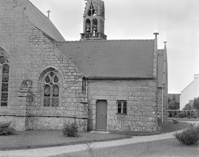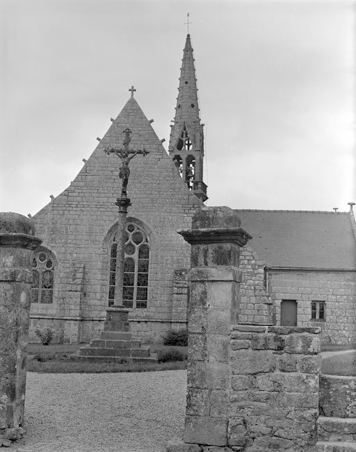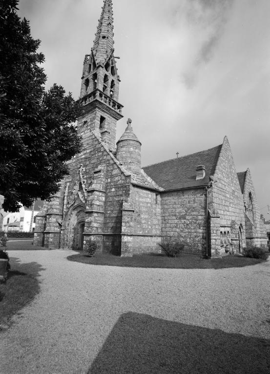 Première campagne de construction terminée en 1505 ; inscription contrefort du clocher "FONDE LAN 1630" "ACHEVE LAN 1641" ; chambre des cloches "M IAC ROLLAND GORGIAS R 1632" ; mur transept sud "SIMO" ; bras nord "1662 ROLLANT MAHE F ROSEN PRETRE CURE" ; chevet mur est "MI : R : G : R 1649" ; arc diaphragme "LAN MIL CINQ CENT AVECQUES CINQ (EST FI (N) " ; CHARPENTE "N : ROSN : FABR : N : TOMAS : FABR : IVON : ANDRE CURE 1651 M : IAC ROLAD : GORGIAS" ; édifice essentiellement 17e siècle ; croix 1882.