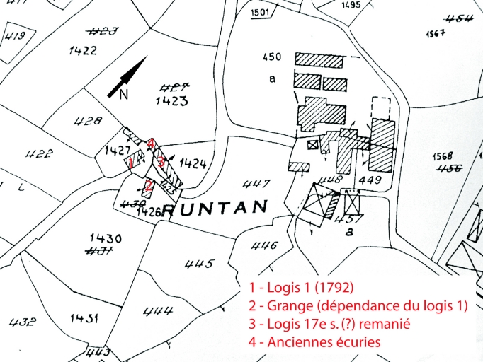 Logis 17e siècle dénaturé, non repéré. Ancienne logis de ferme daté 1792. Communs 19e siècle, dont une grange avec pierre de remploi portant l'inscription M. CAM. Présence attestée d'un marchand de toile en 1799.