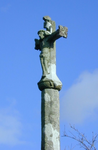 Croix du 16e siècle portant, sur le socle, une plaque en ciment avec une inscription moderne en breton : en hor poaniou en hor nechamant galvomp d'hor sikour an hano iesus a lako do hon daelou ha mel en hor c'huerder (Dans nos peines, dans notre désarroi, appelons à notre secours le nom de Jésus qui mettra fin à nos larmes et du miel dans notre amertume).