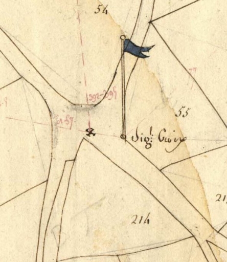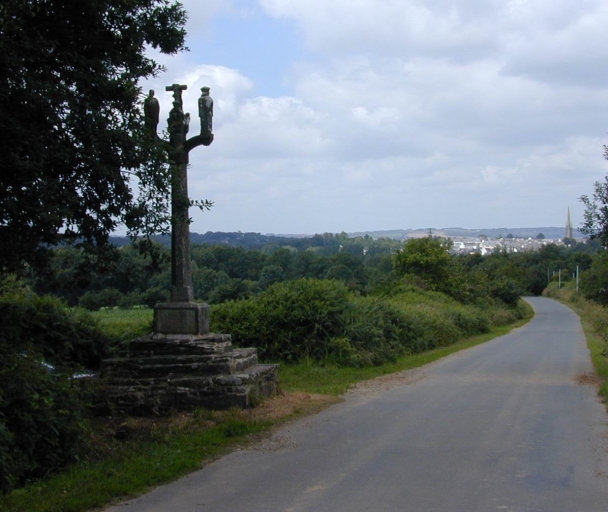 Calvaire réalisé en 1600 à l'initiative d'Olivier Inizan, Anne Messager et Marie Gouriou (inscription largement effacée, sur la base) et restaurée en 1900 (inscription). Il figure au même emplacement sur le cadastre de 1812. Une restauration a eu lieu en 1988.