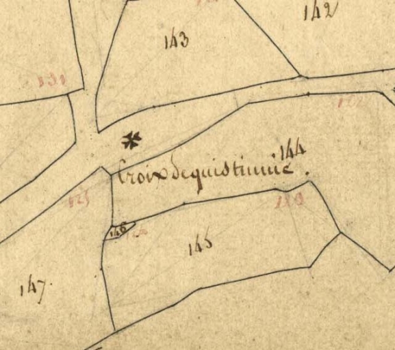 Cette croix, érigée à l'initiative d'un prêtre (calice sculpté), pourrait dater du début du 17e siècle ; elle figure sur le cadastre de 1812.