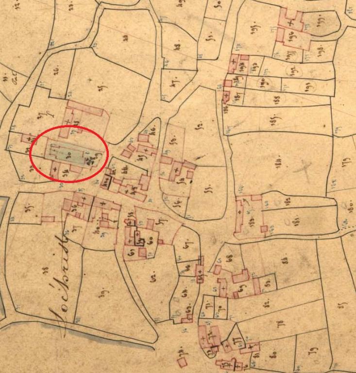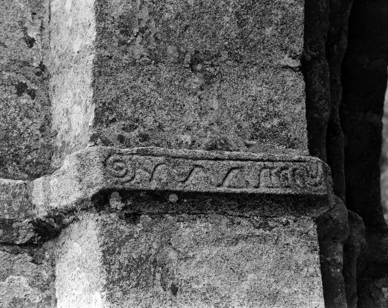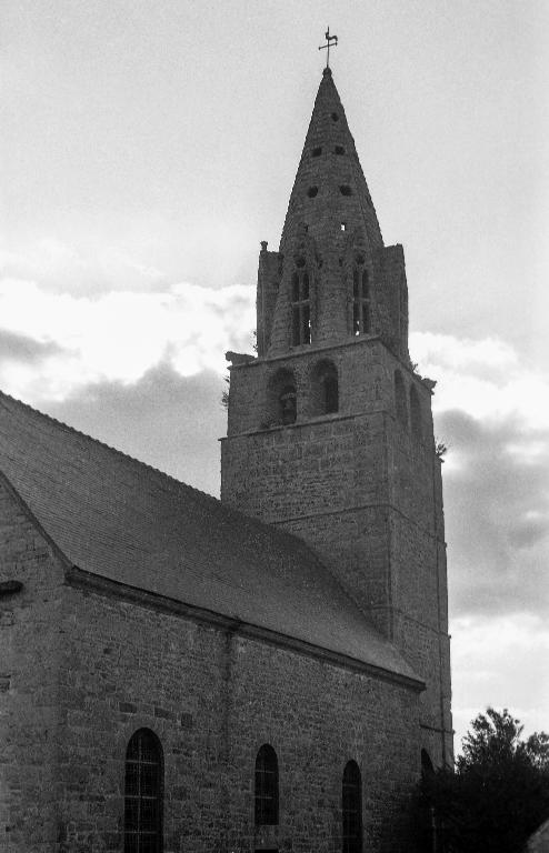 Clocher-porche, en grand appareil de granit, reposant sur quatre grands arcs brisés en tiers-point, à arêtes vives, dont les piédroits, également sans moulures, sont surmontés d'un tailloir continu (bande et quart-de-rond). La bande est en plusieurs endroits gravée de traits formant chaînette, de crossettes, etc.