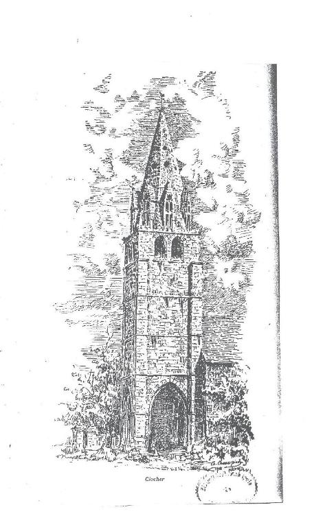 Une tourelle cylindrique d'escalier à vis est engagée sur le côté sud de la tour et monte jusqu'à la chambre des cloches. À environ deux mètres du sol, une grande dalle de pierre, encastrée dans le mur de cette tourelle où elle est posée sur champ, présente sur sa tranche une longue tige sculptée de crossettes adossées que prolonge un épi de seigle ou de blé barbu. Je crois y voir un remploi de l'époque carolingienne. La saillie des hauts pilastres-contreforts est faible ; l'appareillage, excellent, de grand module. La tour n'est éclairée que par de hautes meurtrières sans ébrasement jusqu'au cinquième des cordons ci-dessus. À ce niveau était la chambre des cloches ajourée, à l'est et à l'ouest, de deux grandes baies plein cintre ; au nord et au sud, d'une seule. Ces ouvertures, sans moulures, sont ébrasées extérieurement pour mieux diffuser les ondes sonores.