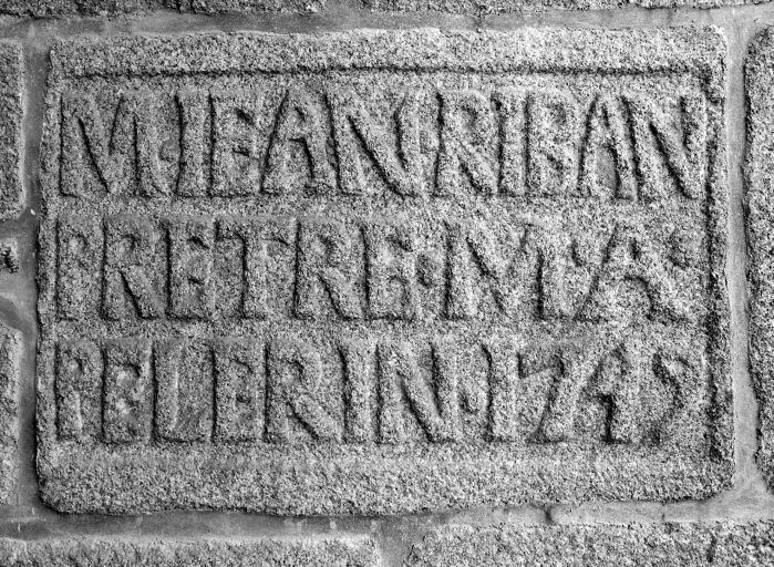 Plan masse, voûte en berceau plein-cintre, chevet plat. Inscriptions : PASSANTS. QUI.PASSES / JAY.PASS.PAR / OU.VOUS.PASSES. / VOUS. PASSERES PAR. O / U JAY . PASSE. PRIES. DIE / U. POUR. UN. TREPASSE / DITES. UN. PATER. ET. UN AVE. M. JEAN.RIBAN / PRETRE. M.A. PELERIN. 1749.
