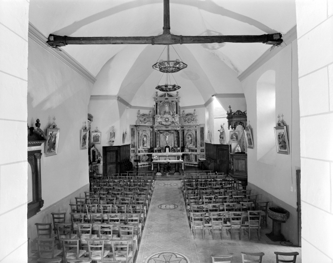 Plan en croix latine, nef avec charpente en bois en partie conservée, clocher en façade, chevet à pans coupés. A noter la conservation d'un ancien retable.