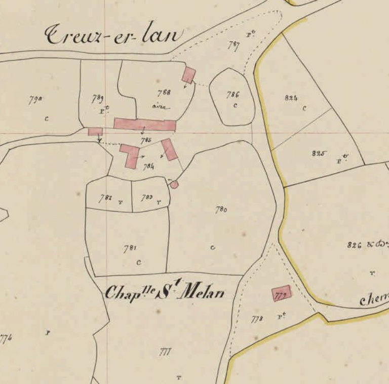 La petite chapelle saint Melen est dédiée à saint Melaine, quoiqu'un saint breton (d'outre Manche) nommé Maelan lui dispute sa dédicace. Ses dimensions modestes intriguent et paraissent en contradiction avec la belle porte sud accompagné d'un blason de grande dimensions : la proximité du grand manoir de Guergrom, construit pour la famille de Guémené pourrait être un indice du commanditaire.