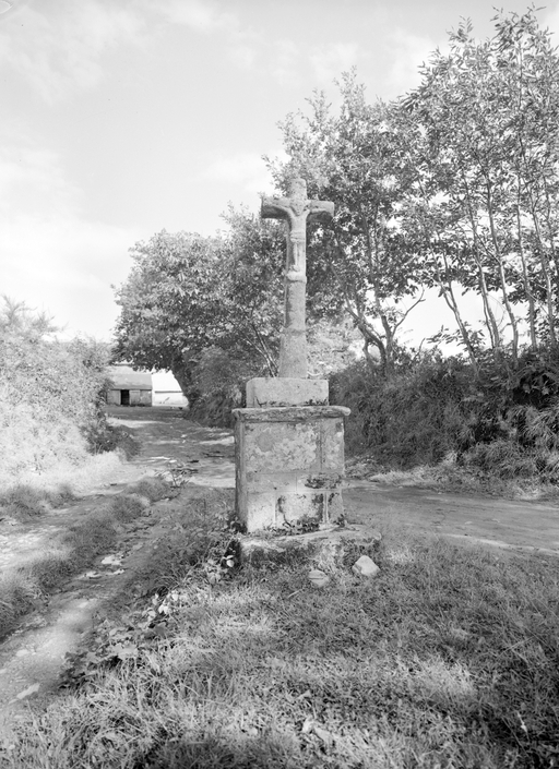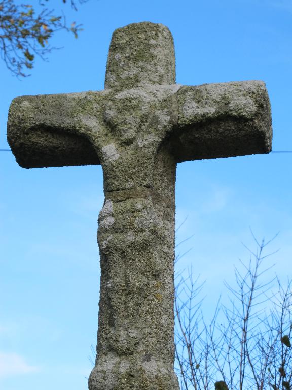 Croix datant probablement du 18e siècle. Il semble probable que le fût, à l'origine plus haut, ait été raccourci. De puis la première enquête, la croix a été déplacée du milieu du carrefour, où elle est figurée sur le plan cadastral de 1842, à l'angle de celui-ci et remontée : les pierres du soubassement ont été remployées différemment, le socle a été cassé. (C. Toscer)