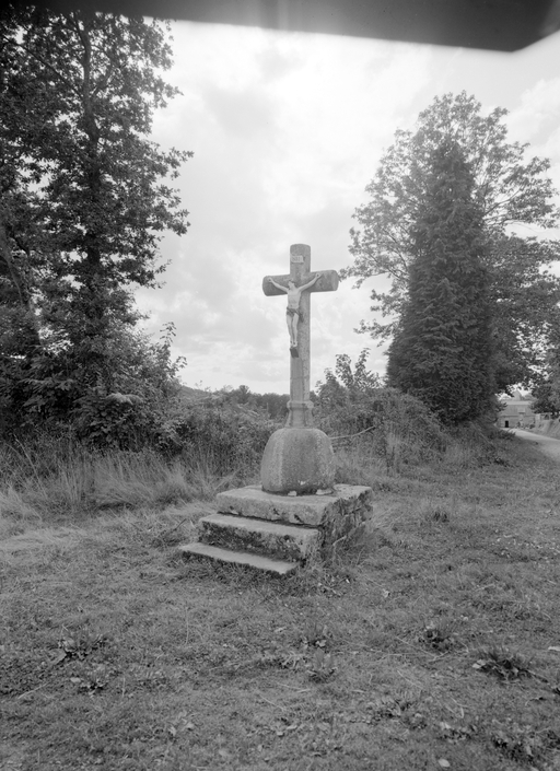 Croix édifiée sur un emmarchement de trois marches qui supporte une stèle hémisphérique dans laquelle est implantée la croix de section circulaire. Un Christ en fonte surmonté d'un phylactère aussi en fonte, INRI est apposé sur la face est.