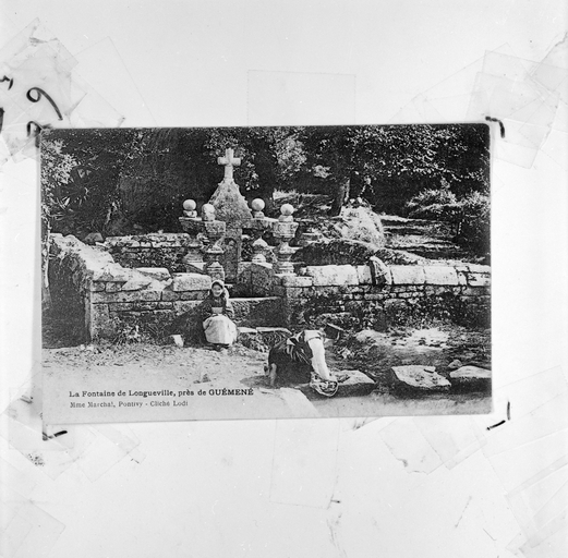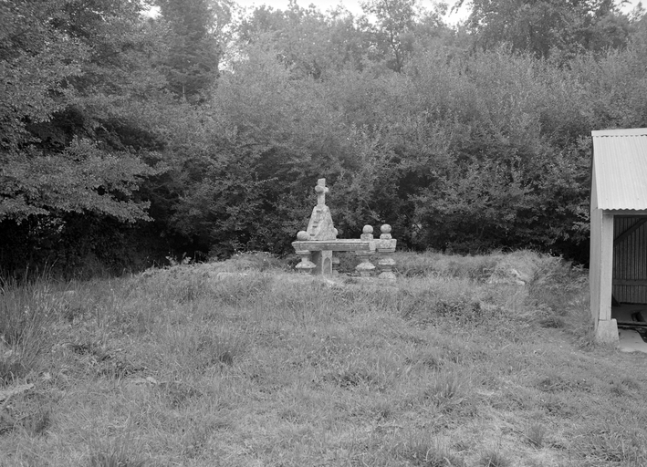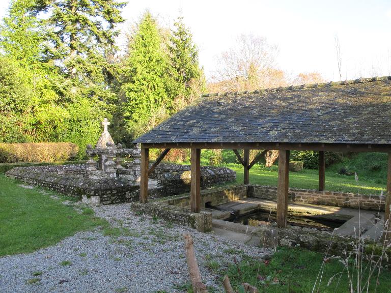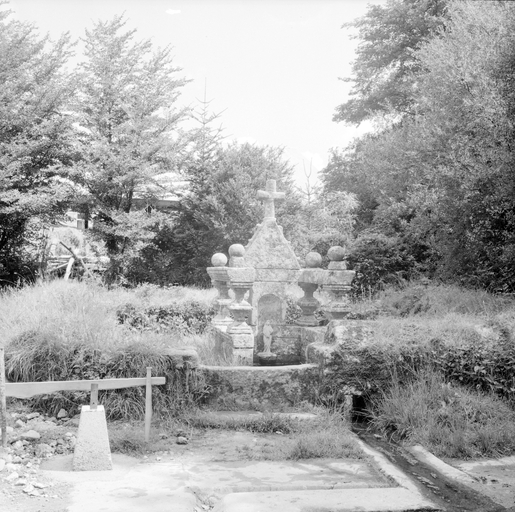 Érigée au 18e siècle, la fontaine Saint-Symphorien diffère sensiblement dans sa structure du modèle dit à pignon fréquemment utilisé pour les fontaines en Basse-Bretagne : les bordures latérales du bassin accueillant l'eau est en effet encadré de murets surmontés de quatre fortes balustres, une particularité locale qui explique sans doute sa protection au titre des Monuments historiques et que l'on retrouve à la fontaine de Kermoustoir à Plouray (qui elle n'est pas protégée). On peut se demander si la pierre triangulaire terminée par une croix qui surmonte la niche à saint n'a pas été ajoutée ou remontée au 19e siècle, d'après la forme de la croix. (C. Toscer)