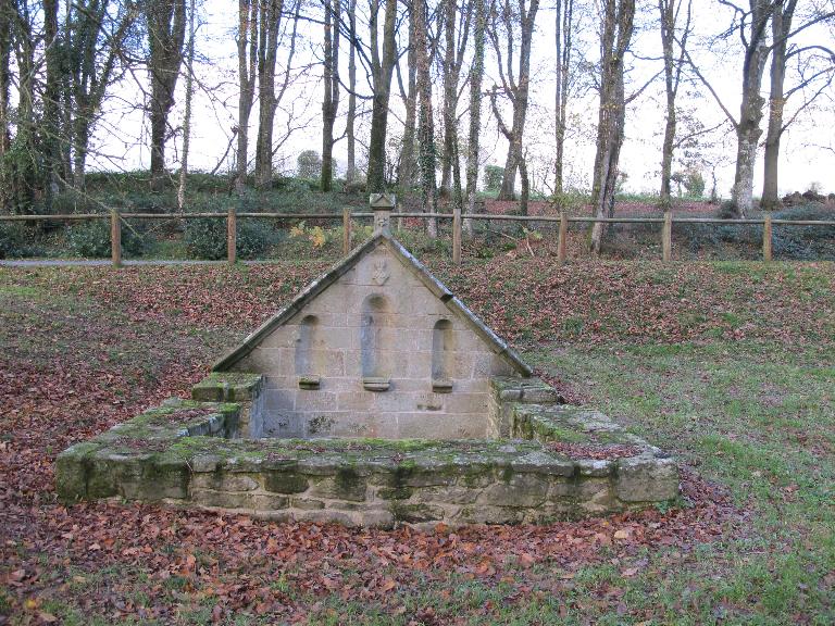 Fontaine en pierre de taille à mur pignon avec enclos dallé. Le mur pignon est creusé de trois niches à saint qui ont perdu leur statue. Au sommet du pignon une inscription illisible pourrait être la date ; une seconde inscription en breton court à la base du pignon (PEDET DOUE ... DOMP).