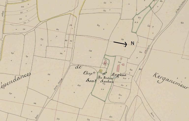 La chapelle est attestée en 1549, dénommée Saint-Tujean, qui semble son vocable d'origine ; il évolue au cours du 17e siècle sous le nom Tuchen, puis Suchen, dédicace sous laquelle il figure sur le plan cadastral de 1841.