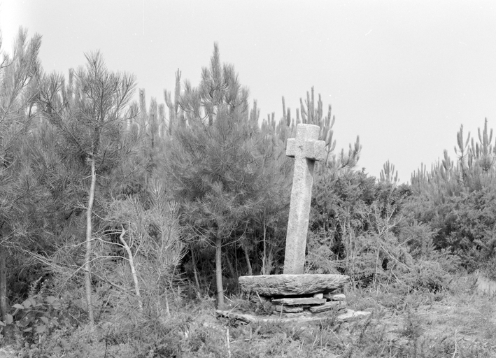 Croix monolithe en granite sur soubassement de maçonnerie couvert d'une dalle de schiste et reposant sur un emmarchement à deux degrés ; fût de section rectangulaire. Décor gravé sur le fût : IHS.