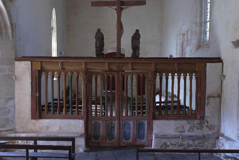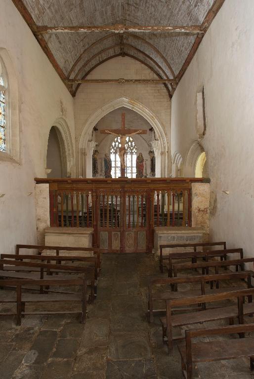 L'élégante clôture de bois qui sépare la nef du chœur, probablement prévue initialement à l'entrée de la croisée a sans doute été déplacée vers l'ouest, dans le contexte d'une évolution du chantier qui correspond à l'ajout des collatéraux nord et sud. Une porte haute découverte dans le mur sud lors de la récente restauration atteste que cette clôture fut conçue pour supporter la tribune d'un jubé, selon un modèle que l'on retrouve dans la chapelle Saint-Fiacre de Melrand.