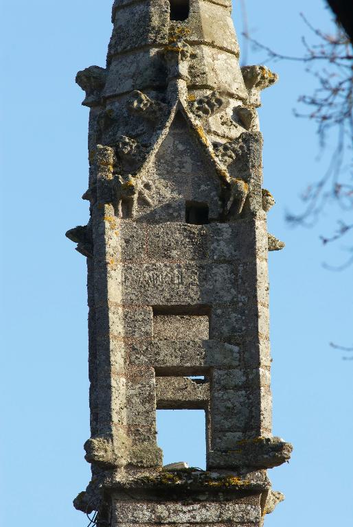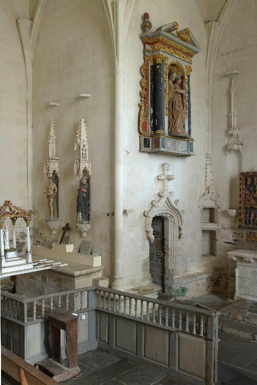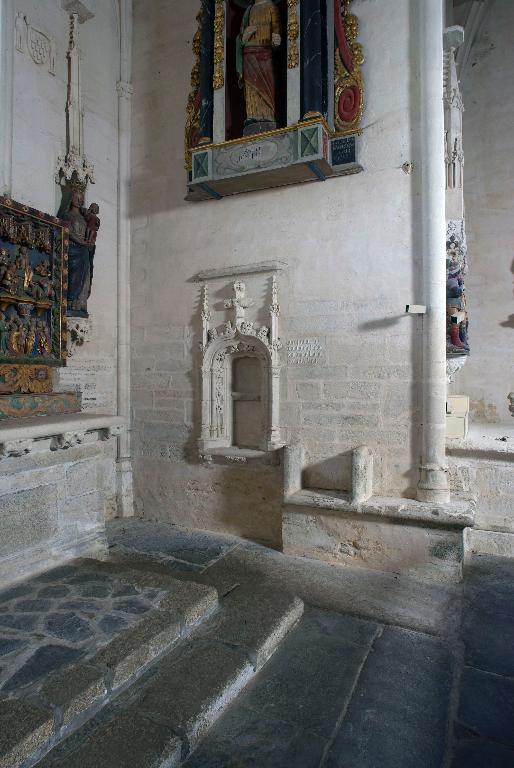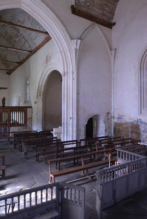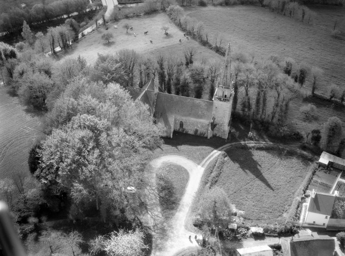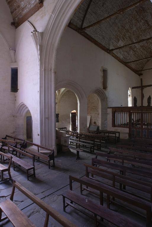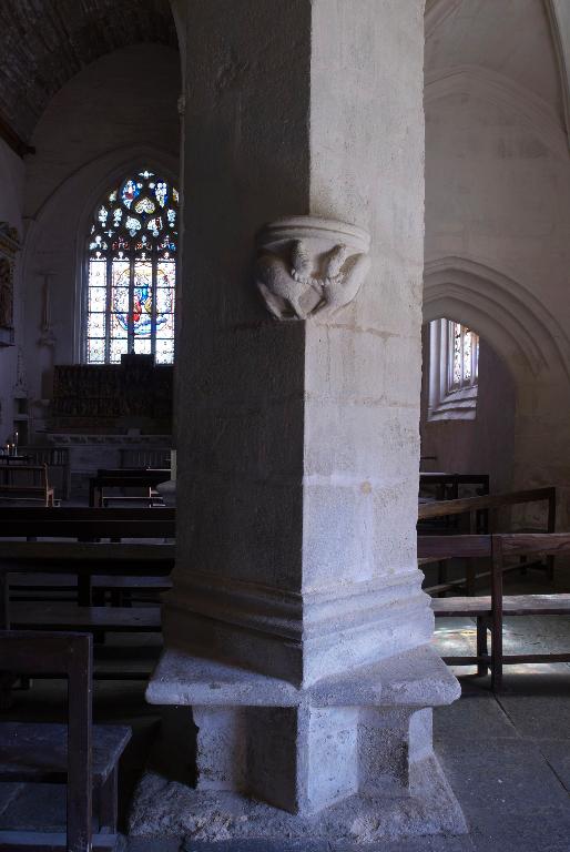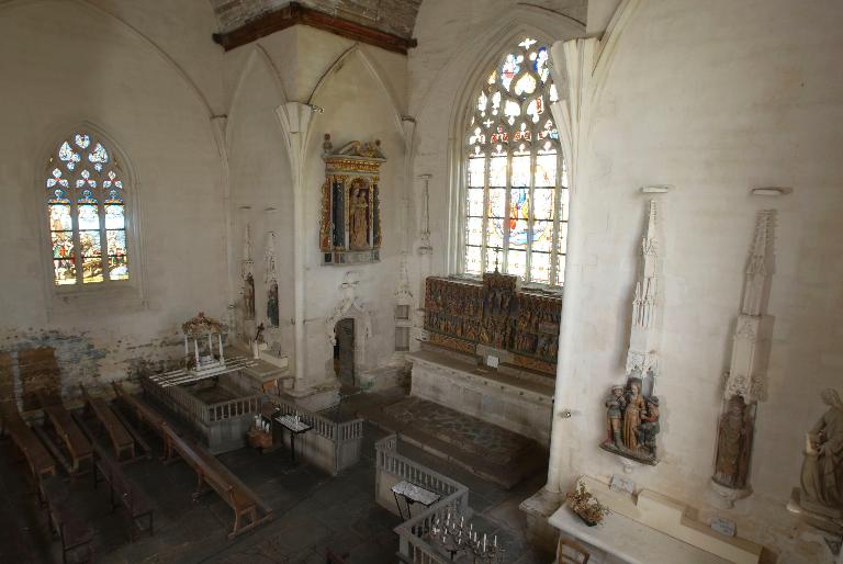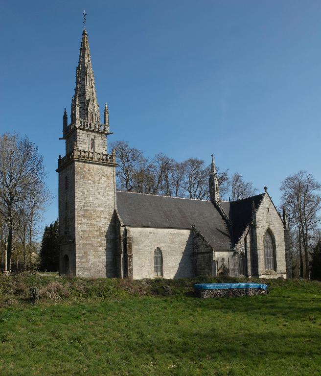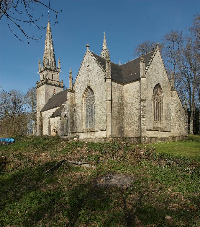 L´édifice présente un plan en croix latine avec un chœur de faible profondeur terminé par un chevet plat. La nef est flanquée dans sa partie orientale de deux bas-côtés que la présence d´autels adossés aux piles de l´arc triomphal doit plutôt amener à interpréter comme des chapelles privatives, dotées d´accès distincts. Dans sa partie ouest, elle se réduit à un vaisseau unique, séparé du reste de l´édifice par un chancel en bois qui peut remonter au 15e siècle. Deux autres autels y sont adossés. La présence du clocher porche du 18e siècle ne permet pas de connaître les dispositions d´origine de la façade ouest. Deux phases de construction se distinguent assez clairement. À la première, appartiennent le chœur, le transept et l´arc triomphal, élevés dans le deuxième tiers du 15e siècle, conformément à l'inscription datée de 1435 présente dans le mur du chevet, à droite de la maitresse vitre. Outre les données de l´héraldique, une datation autour de 1450 est confirmée par le mélange, dans les fenestrages du chevet et du bras nord du transept, des répertoires rayonnant et flamboyant : ainsi, la maîtresse-vitre superpose une série de cinq lancettes tréflées surmontées d'un rang de trilobes aux pointes effilées et un réseau garni de mouchettes. De même, les nervures de l´arc triomphal retombent sur de fines colonnettes à chapiteaux, également présentes dans les piédroits des baies, type de support qui tend à disparaître dans la seconde moitié du siècle. Cette partie présente à l´intérieur un appareil mixte où alternent des assises allongées de schistes et de grès. Le chœur, la croisée et les bras du transept conservent des arcs formerets et des départs de voûtes qui ont pu faire croire à un projet, abandonné, de couvrement en pierre. Cette thèse ne résiste guère à l´examen, compte tenu de l´extrême minceur des supports (des colonnettes baguées d´un petit chapiteau de feuillage recevant en pénétration les départs de nervures prismatiques au-dessus de celui-ci) et de la faiblesse des contreforts à l´extérieur. On peut en revanche imaginer que les tas-de-charge avaient été conçus pour servir d´assise à de fausses voûtes d'ogives en bois, d´un usage répandu en Angleterre et dans les Pays-Bas, et dont la Bretagne conserve quelques exemples du 16e siècle. La même particularité se retrouve d´ailleurs à Saint-Fiacre du Faouët, qui s´élève au même moment. Conformément aux conceptions de l´espace liturgique prévalant à la fin du Moyen Âge, le choeur et le transept, avec les trois autels adossés à leur mur est, forment un volume homogène, dont l´unité est encore renforcée par le mobilier intégré (armoire eucharistique, lavabos à crédence, niches). Il faut souligner le raffinement de ce dernier.