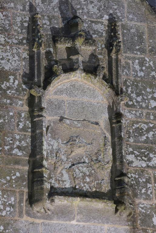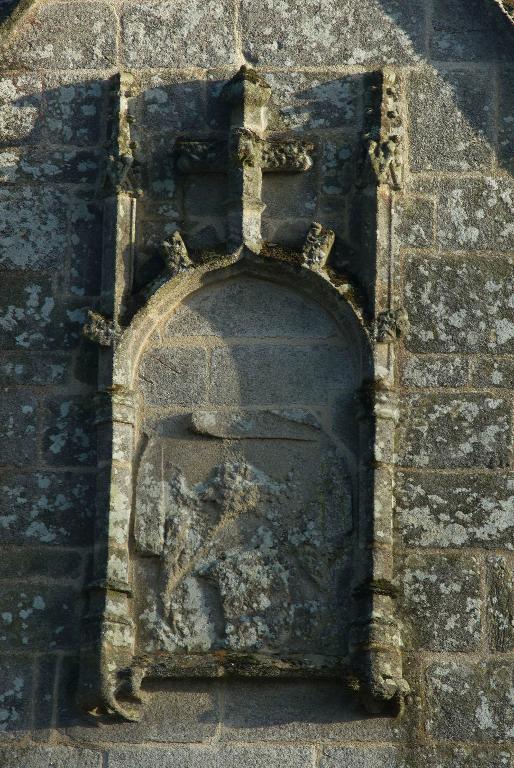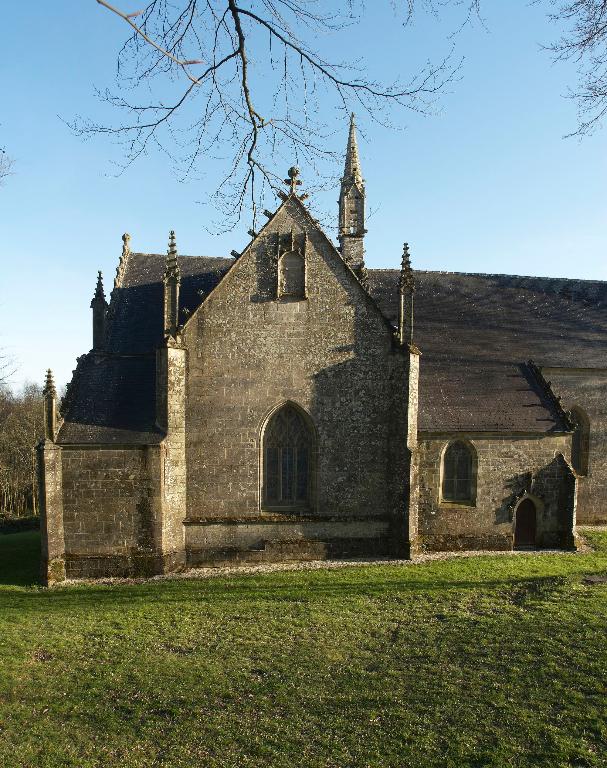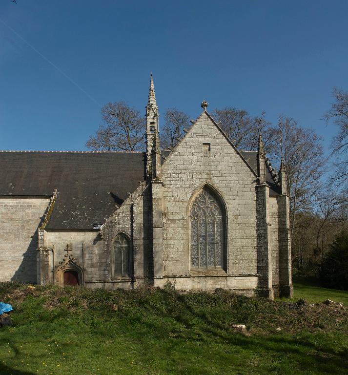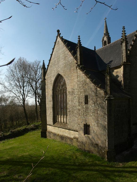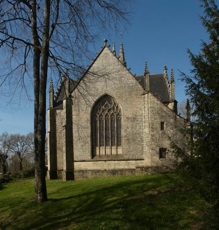 À la différence de l´intérieur, dont les parements sont en appareil mixte, les murs extérieurs sont bâtis pour l´essentiel en grand et moyen appareil de granit. Le chevet forme avec le transept une composition monumentale, plus compacte qu´à Saint-Fiacre du Faouët en raison de la faible profondeur du chœur. Les pinacles qui amortissent les contreforts angulaires, le clocheton placé au-dessus de l´arc triomphal donnent à l´ensemble dynamisme et élan vertical. Tous les pignons ont leurs rampants garnis de crochets et sont couronnés de fleurons. Les modestes dimensions de la baie qui éclaire le bras nord du transept confèrent à la façade de celui-ci un fort accent de muralité, à peine tempéré par la richesse des crochets ajourés et par la niche héraldique, encadrée de deux pinacles et surmontée d´un arc en accolade fleuronné, qui meuble le pignon.