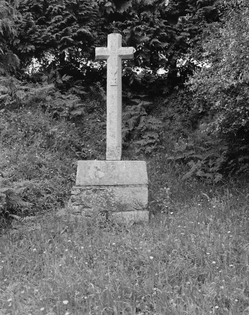 Croix monolithe sur socle et soubassement de pierre de taille ; fût de section carrée chanfreiné à griffes. Décor en bas-relief sur la face principale : calice.