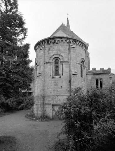 Plan allongé, voûte d'ogives, cul de four, chevet arrondi, style néo-roman.
