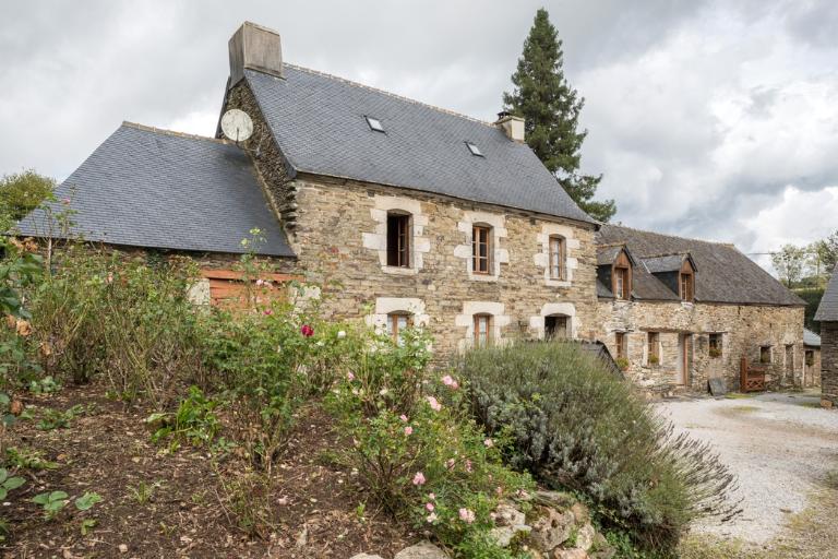 Le logis principal est orienté au sud, sur la cour. Il est construit en moellons de schiste soigneusement équarris, avec des encadrements de baies en pierre de taille de granite. Sa façade est ordonnancée, à trois travées, avec une entrée latérale. L'entrée ouvre sur le vestibule qui abrite un escalier tournant à retours avec jour en bois, construit entre le pignon et une cloison en menuiserie. L'appentis à étage accolé au mur arrière de la maison abrite un cellier au rez-de-chaussée. Il est accessible depuis le vestibule, par une porte ménagée sous l'escalier, et depuis le repos de l'escalier par une porte établie dans le mur nord.