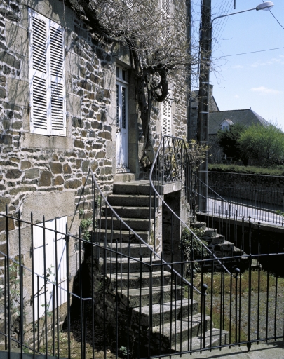 Maison de type ternaire à rez-de-chaussée surélevé, petite cour antérieure. Construction en moellons de schiste, les baies sont en granite.