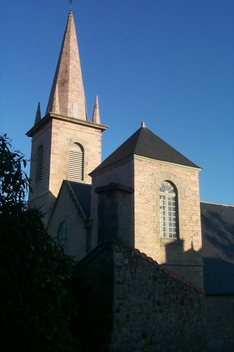 Eglise romane de plan rectangulaire régulier à trois vaisseaux construite en grès, poudingue et granite. Elle comprend une nef et deux bas-côtés réunis sous un toit à deux versants, un choeur de moindre hauteur prolongé par une sacristie plus basse. La nef mesurant 7,80 m de large par 31,30 m de long, est composée de cinq travées anciennes (elle était formée à l'origine de six travées comme l'indique le départ d'une arcade au sud-ouest). Elle est séparée des bas-côtés par des arcatures en plein cintre (cinq au nord, une sud) et en arc brisé (quatre au sud) suggérant deux campagnes de construction remontant à l'époque romane. Chaque arcade est surmontée de fenestrons murés, tandis qu'un grand arc diaphragme en plein cintre sépare le choeur architectural de la nef. Le choeur, au volume important, est ajouré d'une grande baie axiale de style gothique flamboyant conservant son remplage d'origine et portant les armes de la famille de Quéleneuc. Le massif occidental présente enfin deux tours dont celle de gauche est couronnée d'une flèche polygonale en maçonnerie.