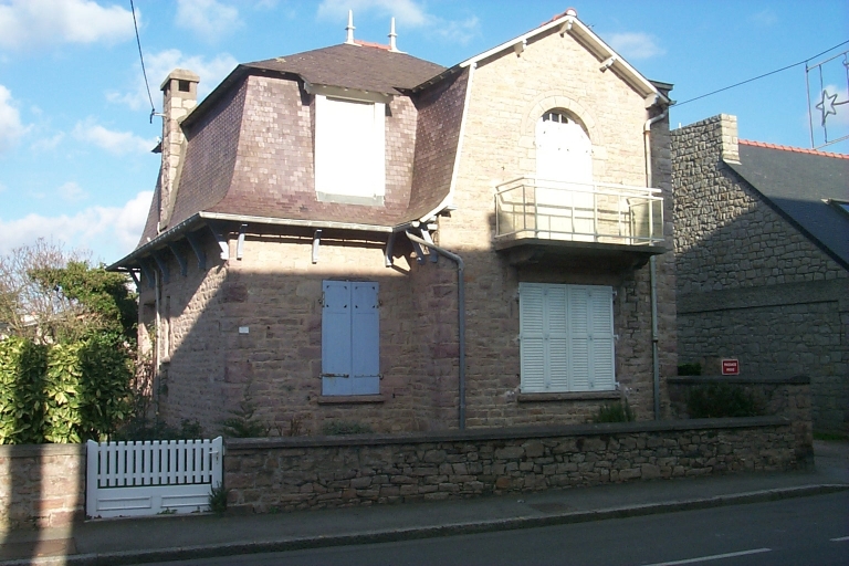 Maison de plan massé à deux corps en équerre, à pignon en façade et à porte d'entrée latérale, construite en grès. Eléments de décor : baie en plein cintre, pignon, épis de faîtage en zinc, toiture brisée.