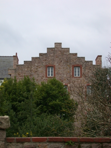 Maison de type ternaire, à pignon à redents en façade, construite en grès et brique.