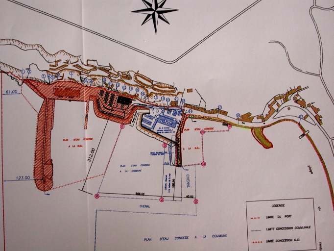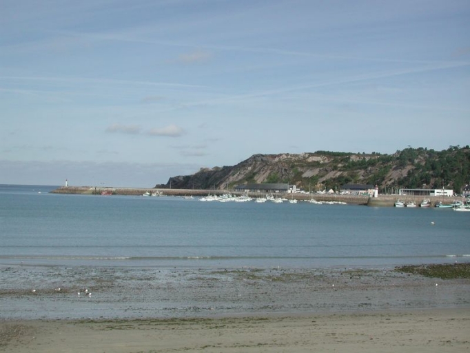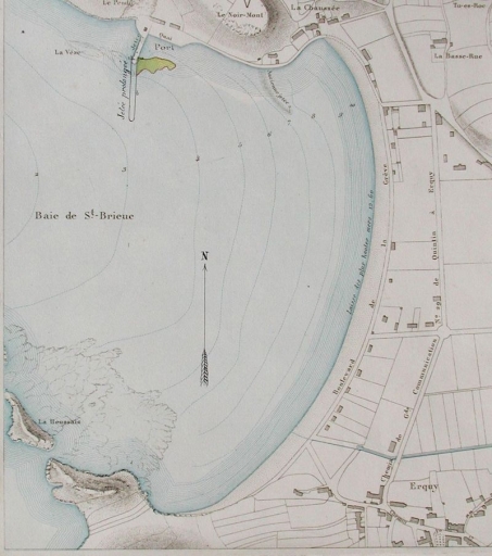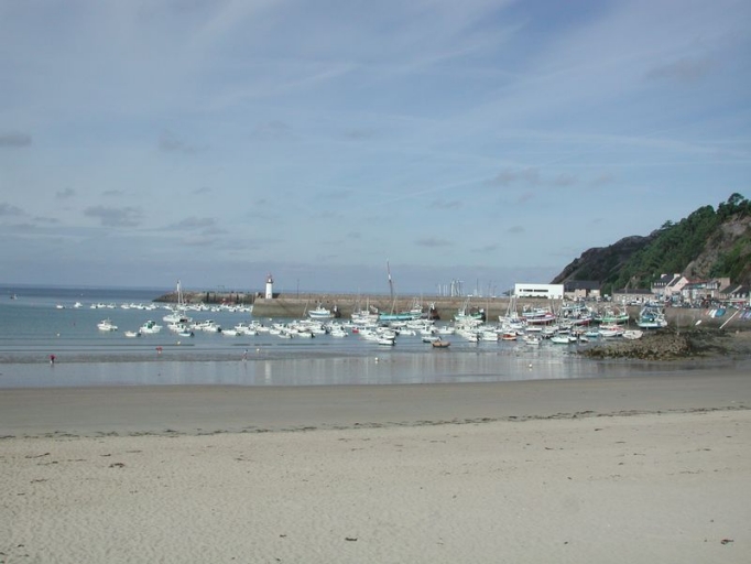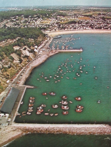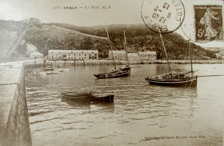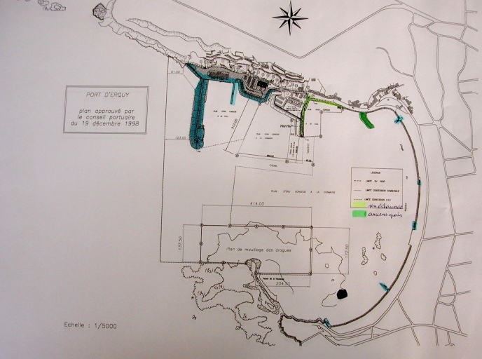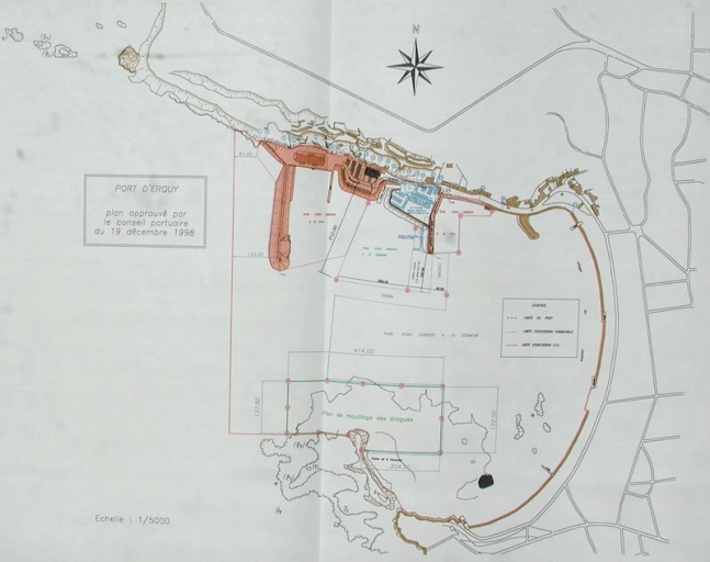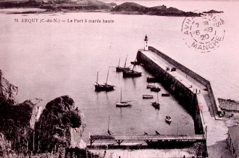 Le port primitif d'Erquy, situé dans la partie nord du bourg, fut en activité jusqu'au début du 15ème siècle. Cet ancien port, protégé des vents de sud-ouest par la pointe de la Heussaye, est attesté par un document de 1648 (Jean-Pierre Le Gal La Salle). Au Moyen Age, ce havre appartient au seigneur de Lamballe, qui y lève des "droits de coutume" (douane) et de "quélaige" (échouage). Une soixantaine de bateaux fréquentaient ce port au 14ème siècle, qui devint un dynamique centre de cabotage. L'Echaussée neuve : construite au 15ème siècle sous l'égide du duc Jean V, dans le nord de l'anse, dite en 1583 "chaussée des roches noires", servit jusqu'à la Révolution et au-delà. En 1768 : premiers travaux demandés par le général d'Erquy, en vain. En 1793 : projet d'une nouvelle échaussée sous Noirmont. En 1832-35 : projet d'une jetée selon le plan l'ingénieur Morin En 1838-40 : construction de la 1ère tranche de la jetée et du môle avec les arcades Les arcades sont condamnées à cause de l'ensablement et murées entre 1841 et 1845 (ingénieur Fessard). La jetée est prolongée. En 1870 : projet d'amélioration du port par l'ingénieur Pelaud (à cause des tempêtes de sud-ouest) et de la mauvaise direction du musoir En 1884-89 : construction d'un quai et d'un chemin d'accès (après destruction du quai de la jetée en 1884), projet de construction d'un bureau et d'un magasin (1886) En 1887 : construction d'une estacade en bois de 30 m pour le commerce des carrières et élargissement du chemin pour la voie Decauville En 1888-89 : exécution du quai submersible et du chemin d'accès En 1892 : enlèvement d'un seuil rocheux (plan de Thébaut et Guillemoto) En 1895-98 : prolongement de la jetée par la société Gaud Frères de Saint-Brieuc, avec couvrement en pierre de taille sur 100 m ; abaissement de la vieille jetée, raccordement avec l'ancienne jetée ; garde-corps en fer au musoir et pierre de taille en grès d'Erquy En 1897 : construction de la 2ème tranche et déroctage du rocher de la Vèze En 1931, 70 bateaux de pêche et de commerce fréquentaient le port d'Erquy (140 tonneaux). Le quai est prolongé de 65 mètres par une cale. Le curage du port est effectué. Création d'un 2ème môle en 1975 et réalisation d'une criée en 1980. Témoignage de Pierre Huby : le nouveau port fait une "butée" au vent, détourne les vents. Par vent de sud-ouest, il était dangereux en doris. Le port des Hôpitaux était aussi utilisé lorsque le port d'Erquy était à marée basse.