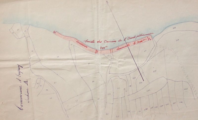 AD Côtes-d'Armor. Série S ; sous-série Série S Art.J 184. Plan de la concession des Carrières de l'Ouest au port d'Erquy : projet de dépôt et de voie Decauville (1885) ; plan : projet de construction d'un appontement ou estacade en bois au port d'Erquy, 1886.