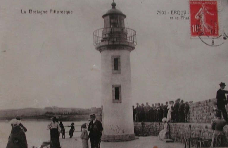 En 1883, fut évoqué le premier projet de construction d'un phare de 4ème ordre à la pointe des Châtelets (section A 1015), selon le rapport de l'ingénieur Guillemoto du service des Phares et Balises, qui soutenait une pétition des marins et négociants d'Erquy : Pour faciliter la navigation entre Erquy et Fréhel, et pour signaler la route à suivre au moyen de deux feux, pour se rendre sans danger à Binic et à Portrieux. 30 bateaux de pêche (120 marins) animaient à cette époque le port d'Erquy selon le syndicat d'Erquy. Le projet initial fut abandonné au profit de la réalisation d'un phare à l'extrémité de la nouvelle jetée d'Erquy, sur les plans des ingénieurs Thièbaut et Ficatier, approuvé par Guillemoto, datés de 1897-98. L'appareil de la lanterne (avec boule et girouette) provenait des établissements Henry Lepaute. Le phare fut mis en service le 9 février 1899. Eclairé à son neuvage au pétrole, le phare fut ensuite électrifié en 1936 avec une batterie. Il est classé comme feu d'horizon à occultations.