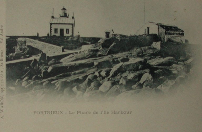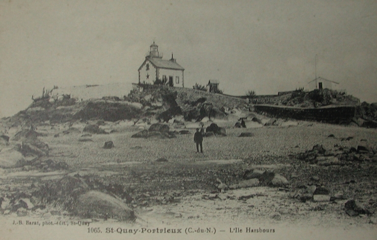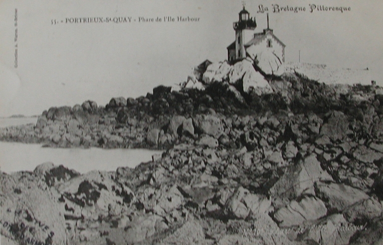 L'Île Harbour, est appelée "Insula Herbora", selon les deux interprétations suivantes : pour l'une, seule île recouverte de végétation de la baie, pour l'autre, elle prit le nom de son ancien propriétaire, une famille de pêcheurs : "l'île à Rebours". Le site d'implantation du phare appartient au domaine maritime. Il y avait à l'origine trois constructions dont deux furent détruites. La fonction de ce phare est de signaliser le danger des écueils des roches de Saint-Quay et l'entrée de la rade de Portrieux. Le feu devait éclairer la passe étroite qui sépare les îles St-Quay du continent, qui représente la seule voie maritime praticable de la baie pour les navires qui se rendent aux ports de Portrieux, Binic, St-Brieuc, Dahouët et Erquy, en passant entre ces îles et les rochers des grands et petits Léjon. Ce furent les armateurs de la baie de St-Brieuc, qui firent l'avance des sommes nécessaires à l'administration pour achever la construction dans les meilleurs délais. En 1890, un rapport mentionnait que "le feu fixe de 5ème ordre de l'île Harbour ne présente qu'un intérêt secondaire pour la navigation depuis surtout l'allumage des feux de Portrieux et du Grand Léjon. Cependant, à raison de sa situation isolée en mer, il nécessite des dépenses élevées pour son entretien qui est confié à trois gardiens. Ces dépenses paraissent hors de proportion avec les services rendus". Ce fut la raison pour laquelle, on décida de faire l'essai d'un feu fonctionnant automatiquement, de façon permanente de jour et de nuit. La tentative s'avéra concluante, ce qui permit d'étendre ce dispositif à d'autres feux, dont Binic et Portrieux. Le feu des îles de St-Quay, au sommet nord-ouest de l'île Harbour, a été édifié en régie par le service des Phares et Balises entre 1847 et 1850, allumé le 6 mai 1850. Le feu fonctionnait au gaz de St-Marcet à l'origine. La maison-phare fut gardienné jusqu'en 1891 ; il est aujourd'hui automatisé. Considéré à l'origine comme un feu de 5ème ordre, il fut transformé en feu permanent en 1891. En 1928, les marins du "Syndicat des marins de Sous la Tour" à Plérin, réclamèrent sans succès, que la portée du feu soit plus faible, afin de ne pas le confondre avec les feux de terre. Le feu fonctionnait à cette époque au gaz d'acétylène dissous. Le feu fonctionne aujourd'hui grâce à l'énergie éolienne et à l'énergie solaire. Jean Dufour, menuisier de profesion, fut l'un des gardiens du phare au début du 20ème siècle. Selon la tradition orale, il aurait aménagé l'enclos en jardin potager et commencé à décorer les murets de motifs géométriques avec des coquillages.