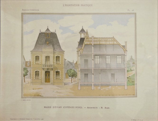 L’architecte Adam propose pour la mairie d’Evran, une architecture qui relève quant au style du passé mais qui s’adapte aux besoins modernes du programme. Le style néoclassique de la construction s’affirme par des encadrements et chaînages d’angles harpés, une haute toiture en pavillon, un avant-corps central, en façade, avec balcon à balustres, coiffé d’un campanile. Une double profondeur du bâtiment a été préférée à une large façade donnant sur la rue. Les façades latérales sont très simples, largement percées pour apporter un maximum de lumière. Le programme pluridisciplinaire permet une économie importante et l’architecte, dans la revue « L’habitation Pratique », n’hésite pas à détailler le coût de la dépense. Même si cette monographie s’adresse principalement à ses confrères architectes, sa parution vers 1908, lui a servi d’outil promotionnel et de reconnaissance parmi ces pairs. Les exemples choisis et publiés par la revue sont tous représentatifs de la tendance architecturale du moment.