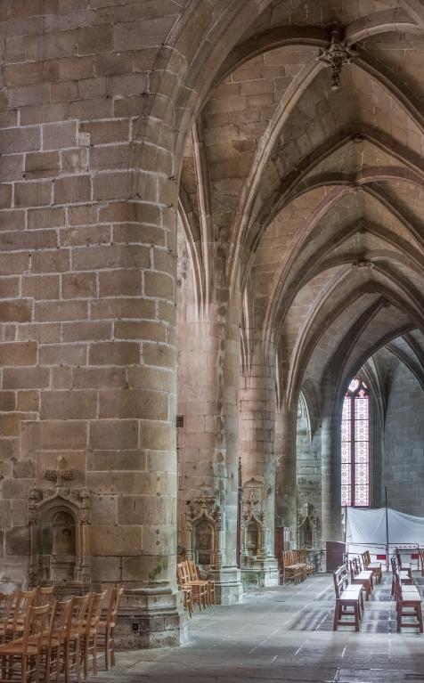 L’emploi des voûtes n'est pas moins remarquable. Les voûtes à croisées d'ogives des collatéraux et du déambulatoire, dont les nervures viennent rentrer directement dans les piles cylindriques du sanctuaire, sont comme prolongées latéralement dans les chapelles latérales des travées droites par des voûtes transversales en berceau brisé, nervurées à l'imitation des croisées d'ogives. Cette solution inédite est sans doute ici liée à une recherche de stabilité : les berceaux transversaux jouant plus que des voûtes d'ogives un rôle de contrebutement. La mention dans les comptes de fabrique d'une couverture provisoire en chaume installée sur le chœur de l'église dès la fin de l'année 1490, signifie sans doute qu'à cette date seul le premier niveau du chœur (les grandes arcades et la couronne de chapelle) est édifié. L'envoi en 1505 du maître d'œuvre Guillaume Juhel à Coutances pour prendre modèle sur l'église paroissiale Saint-Pierre alors en cours de construction, pourrait expliquer le choix qui fut adopté pour les parties hautes de l'édifice. Ainsi, au lieu de l'habituelle élévation à trois niveaux, grandes arcades, triforium et fenêtres hautes, employée jusqu'au XVe siècle en Bretagne dans la plupart des grandes églises, le choix d'une élévation à deux niveaux avec passage en contrebas des fenêtres hautes s'est imposé ici. Toutefois, si l'emprunt du principe au modèle normand est peu contestable, le traitement de l'élévation demeure fidèle à la tradition bretonne. Au lieu du garde-corps continu qui interrompt à la manière d'un bandeau la scansion des travées des nefs normandes, le constructeur breton adopte un rythme segmenté qui réserve l'ajourage du garde-corps à la largeur des fenêtres hautes et privilégie ainsi une lecture verticale. Le dessin du garde-corps lui-même, une suite d'arcatures à trilobes et écoinçons évidés, à l'opposé des tracés compliqués du flamboyant, reprend un modèle vieux de plus d'un siècle, largement employé au XVe siècle dans les triforiums bretons. Enfin, pour éviter l'emploi d'un mur épais, l’architecte reprend une solution introduite dès le XIIIe siècle dans la nef de Dol, celle du recours à des séries d'arcs qui retombent sur des corbeaux de pierre.